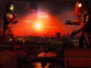 一つ文句を言いたいのは、撮影OKのジオラマセット。いわゆるメトロン星人との夕焼け対決なんだが幕が低すぎて後ろの壁が見えちゃうんだよなぁ。引いて撮ると後ろがしっかり見えてアップにするとアタマがキレる。暗いし赤いしこりゃわざと撮りづらくしているとしか考えられねーw