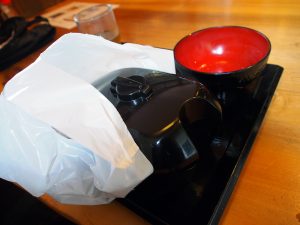 お持ち帰りするために袋がテーブルの脇にある