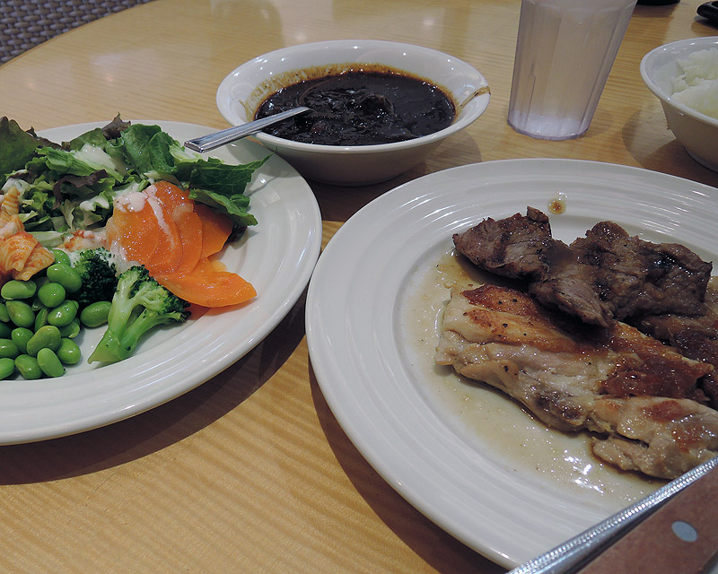 映画観る前にステーキ食べ放題の店で食べたのだがイマイチすぎ。牛豚鶏とあるのだがどれも肝心の肉がステーキという割に薄すぎて焼き加減が殆どウェルダン状態だし、固すぎ!ビーフシチュー(奥の皿)の肉の方が柔らかくって美味かったぞ(呆)