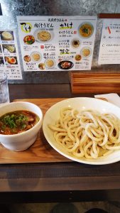名物の肉汁うどん(並)を頼んでみる。ものの5分で出てきたよ!麺は極太超固め色もグレー。いわゆる喉ごしツルツルシコシコとは対極にあるガッツリ歯ごたえ十分系のうどん。汁は甘辛い濃厚汁でワタシにはちょっと濃すぎたかな。具だくさんで食べ応えはあるし、これなら大盛でも良かったかな。薬味も沢山あるので味チェンジも出来るし。ただ店員が鬱陶しいというか、ちょっと席を立ったからって『どうなされました!』って言い寄るのははっきり言って迷惑だよ。食い逃げするわけじゃあるまいしなぁと言うかモノが来てないんだから食い逃げすら成立しないわ(汗)
