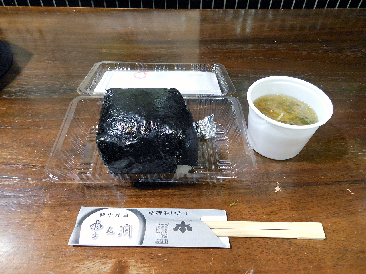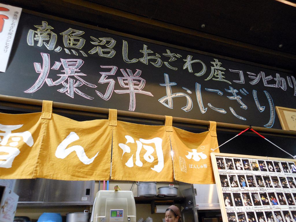 30分近く駐車場待ちしてようやく店内へ。全部の予定をキャンセルして今日の目的をこれにした理由はある。越後湯沢駅構内のぽんしゅ館内にあるおにぎり屋さんが評判というか、超特大おにぎりを魚沼産コシヒカリで出すという『雪ん洞』で食べてみたかった。毎年ぽんしゅ館で日本酒を嗜むのが恒例なのだが、呑んでこのサイズを食べるとなると至難の業。オマケに営業時間は短めで夕飯替わりにもならないからなかなか計画には組み込めなかったのだが今回は開き直って日本酒も諦め?今日の予定はこれのみにした。ノンストップで来た理由も出来るだけ早めにメシ抜きで来たかったからだ。