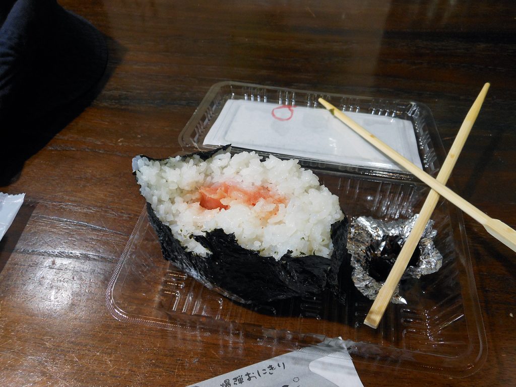 具をシャケ明太子にしてかぶりつく。美味い。確かに美味い。食べるのに一苦労するがw。メニューは十数種類あって裏メニューでミックスも頼めるらしい。4合炊きのグレートなおにぎり食べるとインスタント写真取って飾られるんだがちょっと無理だな(汗) 。車を置いて観光しようかと思ったけど、雨も酷くなったし近場に面白そうな所も無いのでとっとといつもの宿に行くことにした。