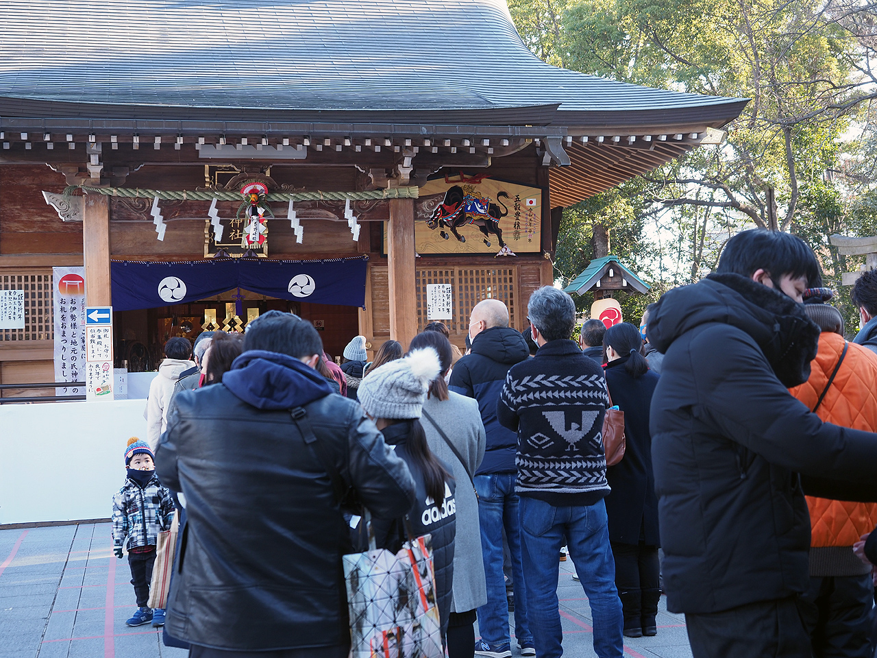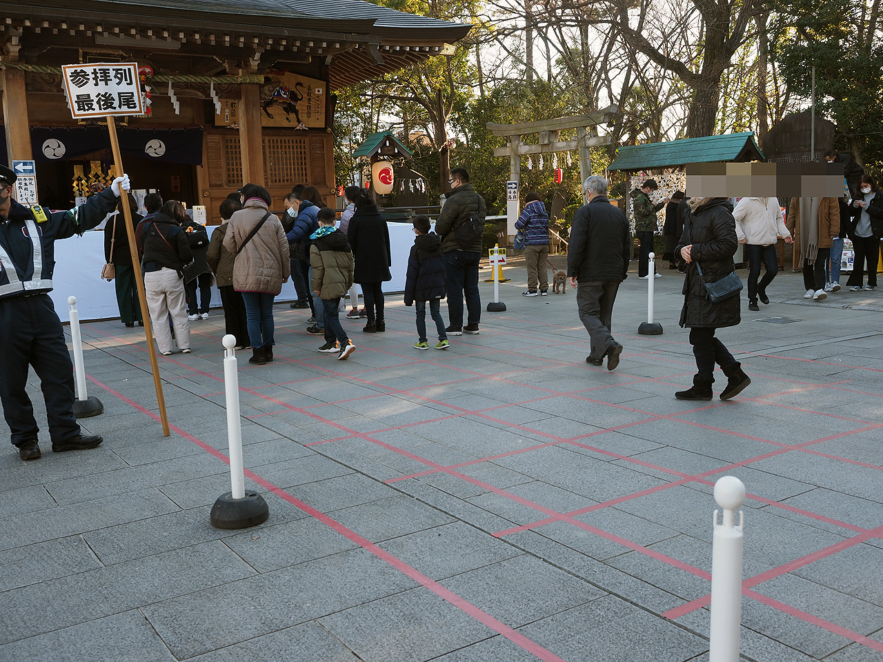 時間帯もあるようですが若干少なめですね。そしてマス目に沿って並ぶというソーシャルディスタンスを護って参拝です。神様もコロナには気を遣っているという事でしょう。