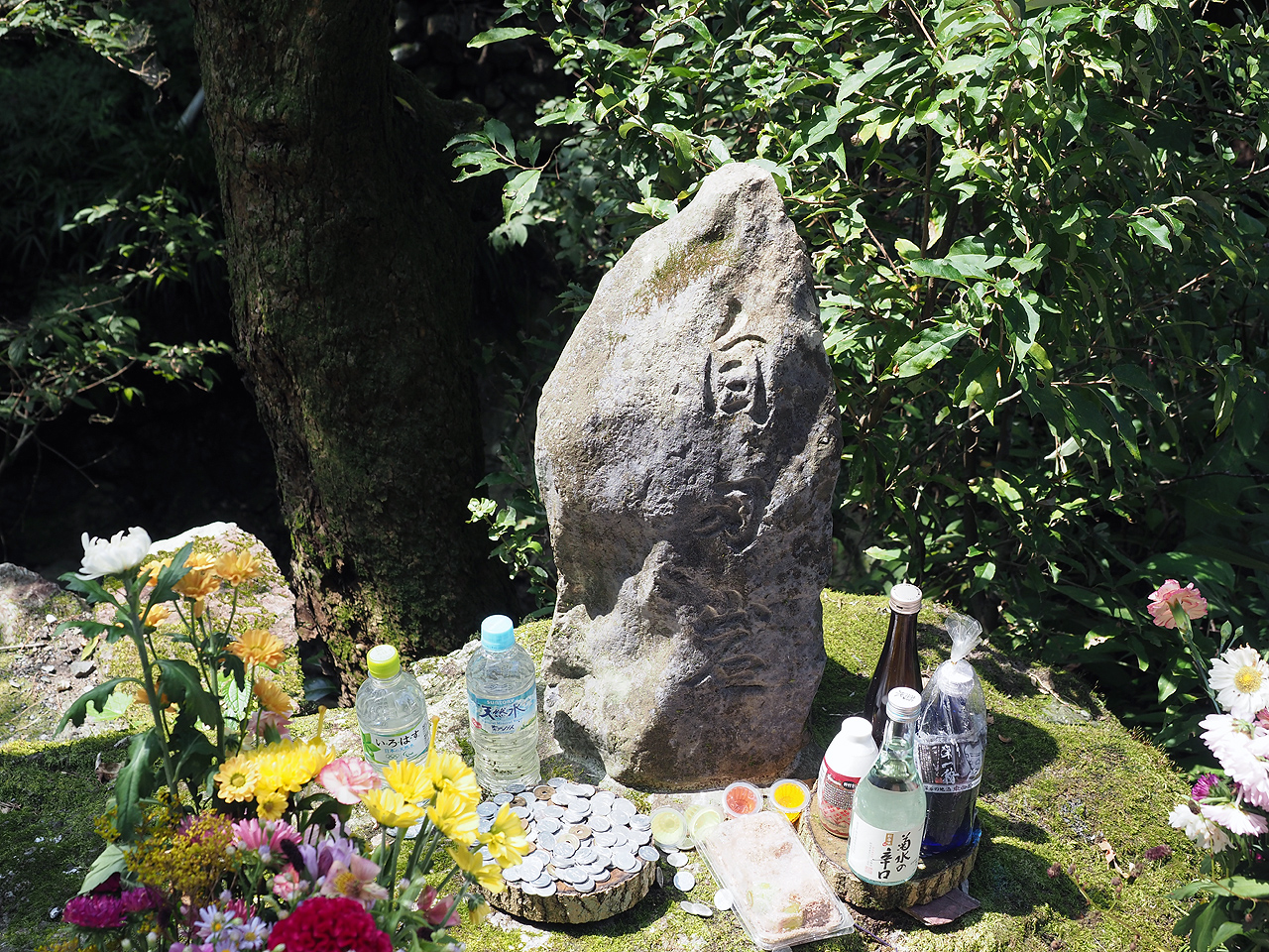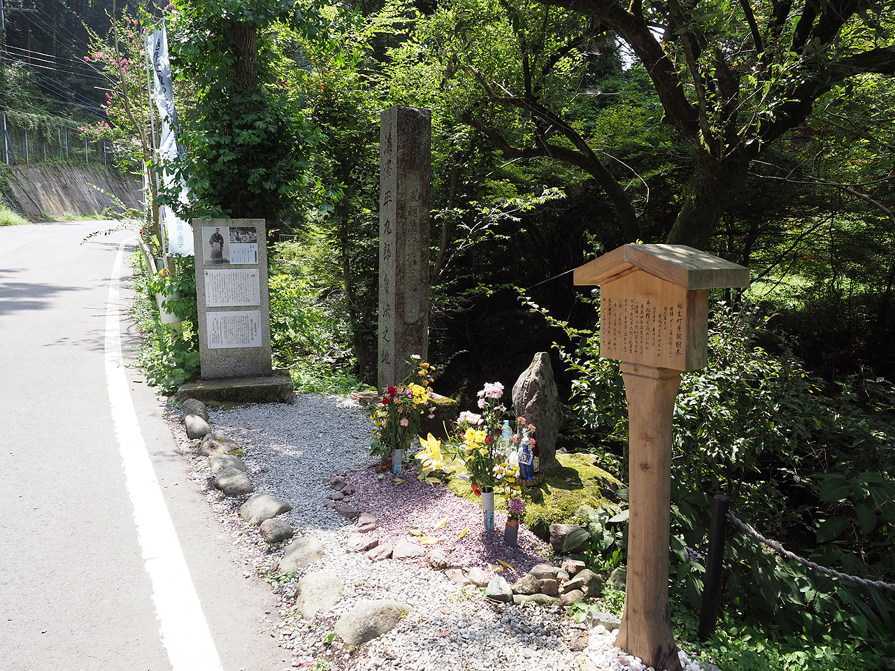 9時半に出発。渋滞はほぼ無くスムーズなツーリング。でも暑いんだよねぇ。停まると猛暑でまいる。それでもサクサク進んで県道61号の前回失敗したあじさい街道より更に山に進むと県道の末端辺りに平九郎の碑がある。その手前の『渋沢平九郎の墓P』に黒エフを置いていく。駐車場は7,8台駐車している。流石ニワカにブームだな。400mほど道なりに歩いて行くと道端にポツンとあるじゃ無いですか。