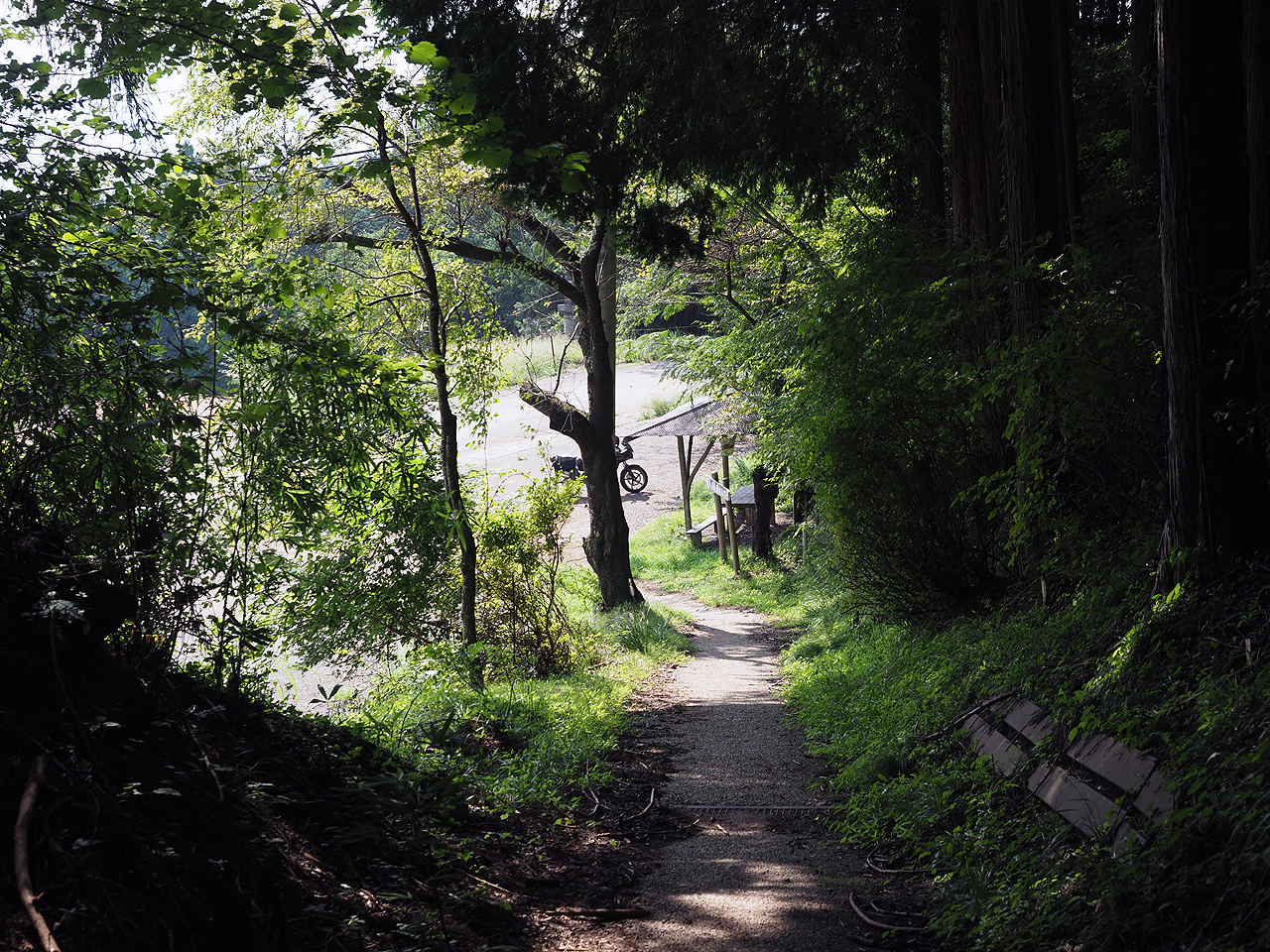 獣道か山道かよく解らない急勾配の坂道をひたすら登る。木々に囲まれて天辺がよく解らないまま道らしい道をひたすら登る登る登る。既に息が続かない。登っては一休みしつつ登る・・・そして林道に出て心が折れる。駐車スペースは無いけどバイクなら置ける十分なスペースがあるじゃないか!しかしここがゴールじゃない。入口だ。ここまで来たらもはやネタ探しだ!入口から再び登る登る立ち止まる登る立ち止まる嗚咽する・・・そしてようやく辿り着いたら酸欠で動けなくなった!