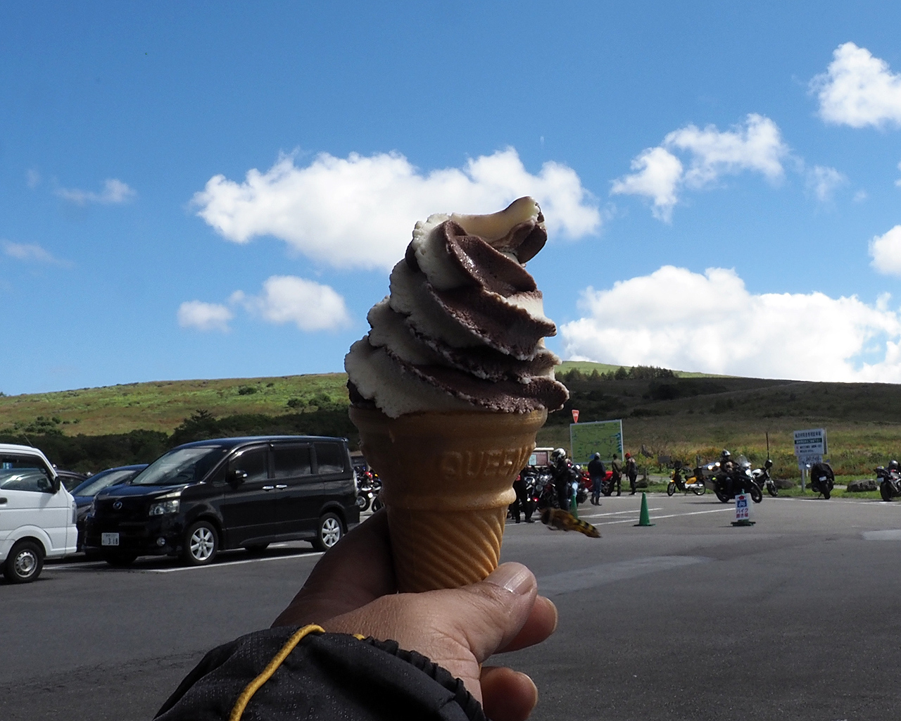 ビーナスラインに入ってまずは南下して霧ヶ峰を目指す。車では走ったことがあるけどいつぶりか・・・全く覚えていない位昔の話。標高はゆうに1500m位あるはずだけど黒エフはインジェクション仕様なのでパワーダウンは見られない。赤ゼルは1000m越えると明らかに力が落ちたのに。ただ流石に250ccで下手っぴポンコツライダーだとガンガン走ると言う訳にはいかずタイトなコーナーを恐る恐る走る。林間を抜けて標高をぐんぐん上げていくとやがて蒼い空と緑の丘に辿り着く。霧ヶ峰の大駐車場、霧の駅だ。ここでまず休憩。馬に乗ったり緑の丘を歩き・・・というのは今回は止めて周りをうろちょろするだけに。結構観光客がいるみたいで大駐車場も八割方埋まっている。緊急事態宣言はどこいったっていうか長野県は別か(汗)。と言う事で今日のアイス!ってこれスジャータの既製品アイスじゃんか!意味ねーなぁ(汗)