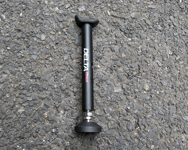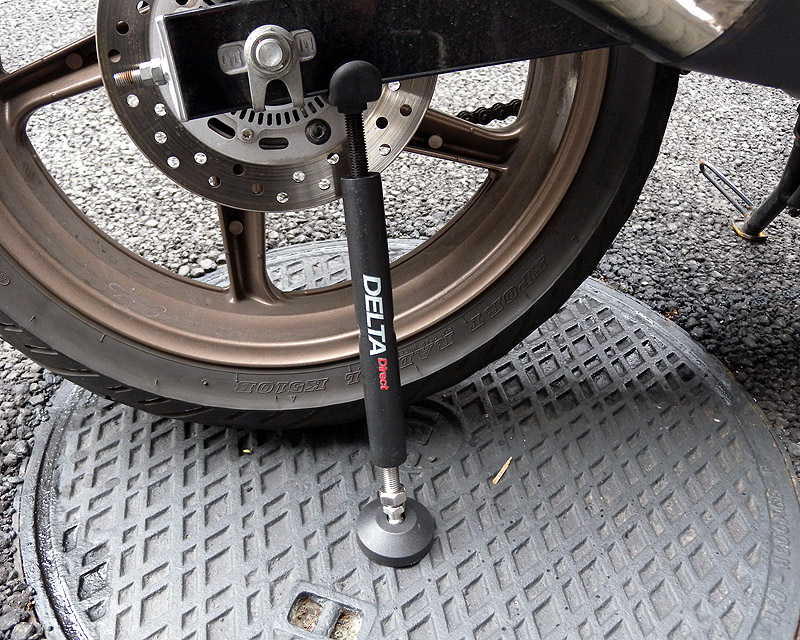 要はただのつっかえ棒なんだけど、スルスルと伸ばしてある程度になったらはめてアジャストさせて浮かせるだけ。足はボールジョイントとラバーなのでフィットしやすいし、支えるアームもラバーが張ってあるので傷つかない。本体を回して伸ばすのだけど手でも回れば穴が空いていてドライバーでも差して回すことも出来る。おお、結構手軽だわ。バイクのスタンドと2点で支えるから荷重がかけられないのが欠点。股がるのもダメだけど後輪浮かしてのネジ締めも厳しいかなぁ。まぁ空転させての作業、チェーン掃除ぐらいなら十分であるが。