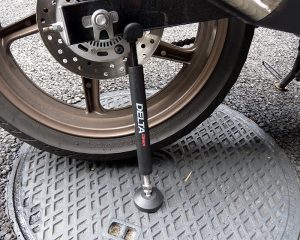 そこまで外出して食事がしたかったのは翌日に黒エフでお出かけしたかったからでその前に前々から気になっていたチェーンのメンテナンスをしようかなと。しかしながら黒エフは赤ゼルに付いていたセンタースタンドがなくそういった車体を固定したり後輪を浮かせるメンテナンスがしにくい。オマケにシングルサスなのでスタンドも選びにくいのでどうしようかなと思っていたところにこんな商品が二輪館にあったので買って使って見ることにした。