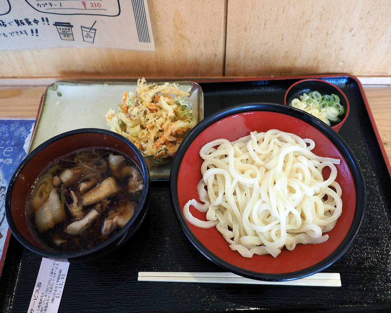 11時半過ぎに入店したけど既に行列が出来てました。それでも流れているのでさほど待つこともなく自販機でスタンダードな肉汁うどんをチョイス。平日限定で麺の量を選べる。並で300g、中で450g、大で600g・・・とても喰えなさそうなので並盛り。さほど埋まっていない店内の座席に座って喰ってみた。う”ーんごく普通。うどんも普通、肉汁も普通、別皿で頼んだかき揚げも普通と言うか揚げている厨房を観てたんだけど具を素揚げしつつ追加で溶いた小麦粉を入れてたなぁ。そんな作り方だっけかき揚げって?
