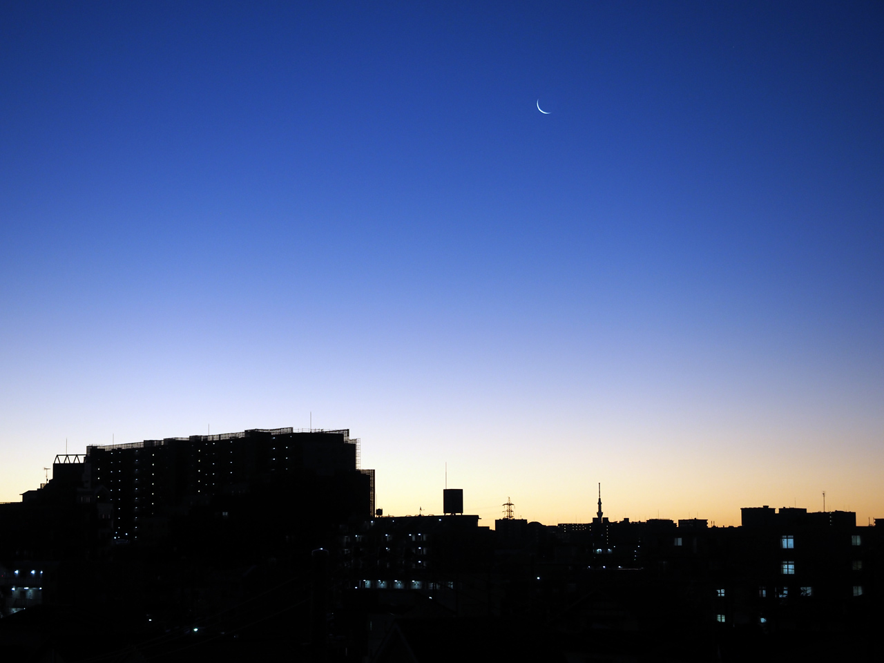 日の出を待とうと思ったけど寒くて無理でした(爆)。スカイツリーと下弦の月です。