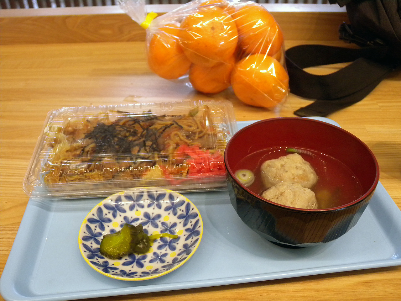 貧乏というか、小洒落た物が食べたいわけじゃないんだという訳でヤキソバとつみれ汁とさっき買ってきた持ち込みみかん。今年のみかんはほどよい甘さと酸味で当りかなと。みかん狩りしたかったなぁ・・・