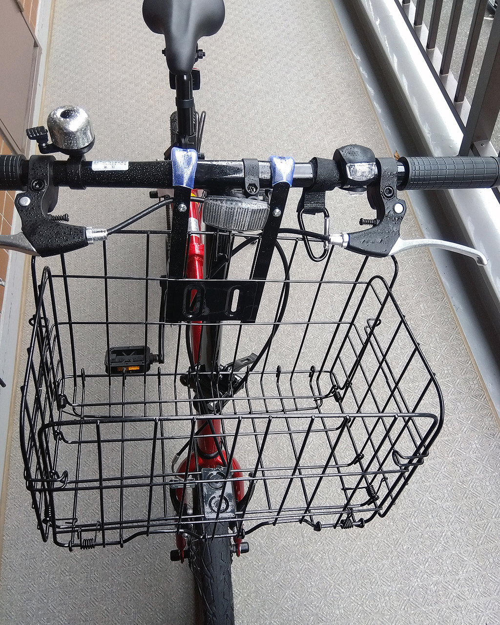 昨日の朝Amazonプライムデーらしいのでチャリカゴをポチったら昨日の晩にモノが届いたよ(汗)。流石に夜勤明けで怠いので今日の朝にささっと取り付けてみたらジャストサイズだった!これと言って予定もないのでチャリで近所をお出かけ。荷物も買い物袋大1つ入るしふらつくこともなかったので満足です。方掛けフックのみの固定なので結束バンドで固定して完了です。あとはまともなライトを付けるだけだ。(一応無灯火で捕まりたくないのでちゃちいLEDライト付けてます。それなりに明るい)