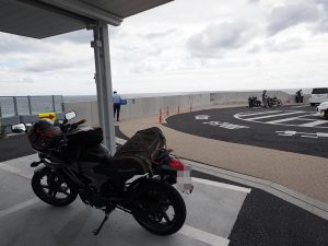服を乾かし中に一枚ウインドブレーカーを着こんで出発。ようやく雨も止んできて濡れたジャケットも生乾き状態まで回復。でも靴は湿ったままで気持ち悪いわ。横浜新道、R1、新湘南と道路はさほど混んでいないのが救い。西湘BPに乗る頃にはすっかりツーリング日和モードになっていた。サクサクッと進んで西湘PAに到着。あの台風で廃墟化したこのPAがどのように復活したのか確認するのも今回の目的の一つでした。