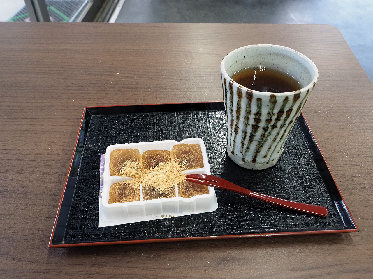 待ってても富士山は拝めそうもないので売店で一服。自分の中でラズベリー賞だった抹茶ソフトは既に無くなっていたので安倍川もちとほうじ茶(冷)セット。まぁ手作り感ゼロなのは仕方が無いか。それなりに安いしなぁ。