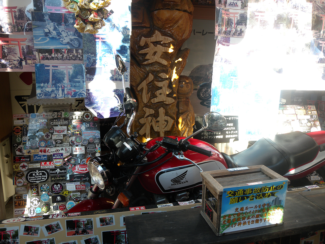 道の駅筑西で昼飯をおごって貰って(爆)。裏道を駆使したので快適ツーリング&トークでバイク神社に13時半まえに到着。同僚は御朱印収集家なので御朱印を貰って爆買いして14時頃に次のバイク神社に出発。