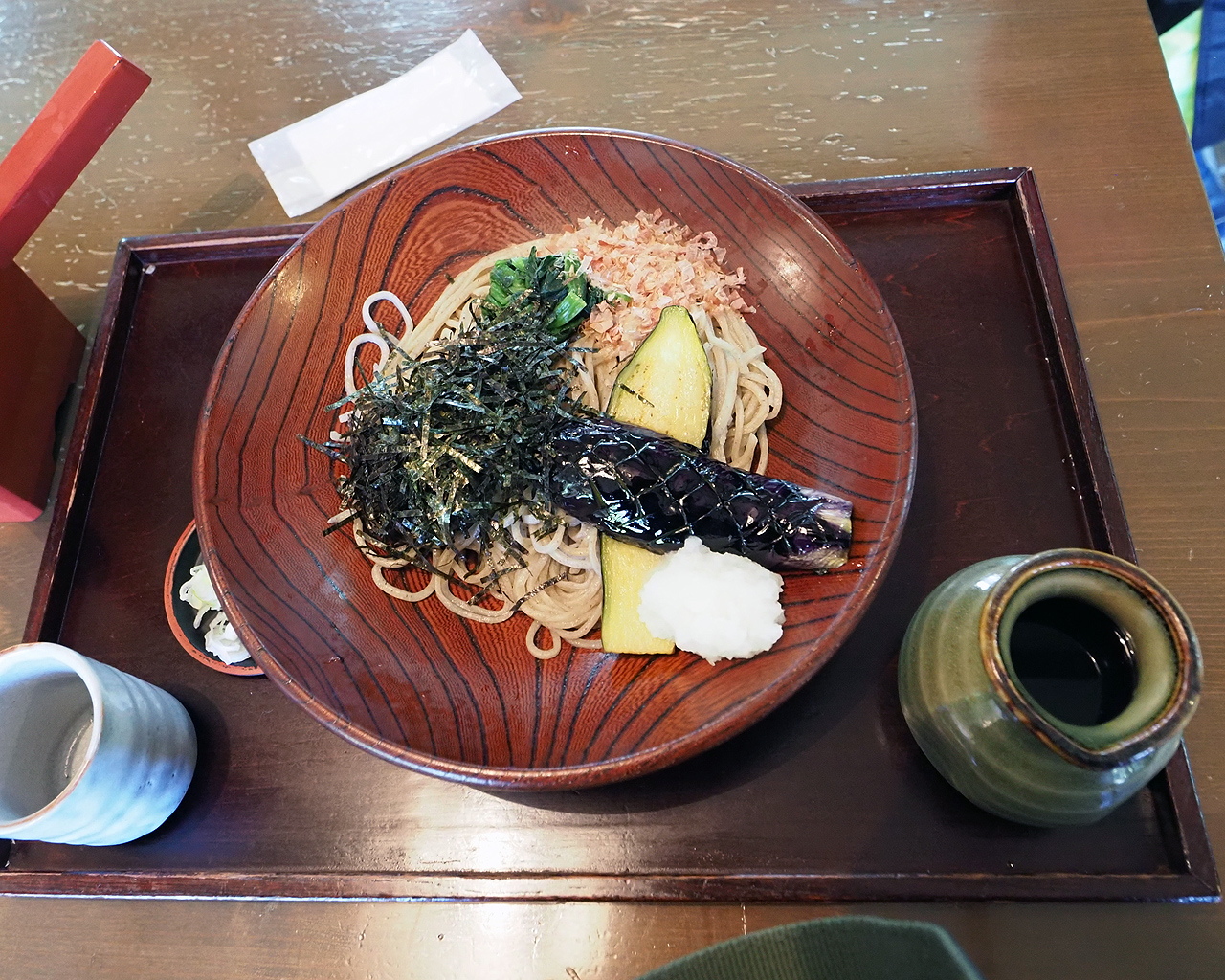 周りに店が無いためか、それでも多少の観光客を捌くためか店内はほぼ満席状態。運良く1卓空いていたのですぐに着席してメニューを見るとそこそこ良心的な値段。で揚げ茄子おろしかけ蕎麦を食べてみるとこれがなかなか美味かった。揚げ茄子大好きなワタシにとって満足する1品でした。値段も1000円以下だし満足だわ。
