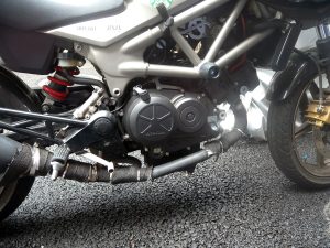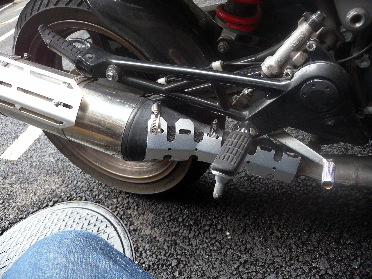 実際にポチったのは旅行前で旅行前に対策しようかなと思ってたのですが中華製の直輸入品らしく翌日入荷にはならず届いたのは10月に入ってから。御周知の通りそこからいろいろあって手を付けたのが今日。でやってみました。アルミ製のガードはクネクネ曲がるのでマフラー付け根のカーブにもフィットして違和感なしでした。しかしそのフィットが大問題というかマフラーの熱が伝わってくるかなと感じ外した耐熱布を巻いて装着してみたモノの上手く行かず結局は直付けで申し訳程度に耐熱布を差し込む。案の定熱問題は解決せずでした。うーむ見た目にはカッコイイしマフラー側のガード(写真左)は全く熱くならないんだけどな。そっちみたくガスケットシートで巻けばいい感じになるのだろうか。再考の余地ありだがカッコイイからまぁ良いか。