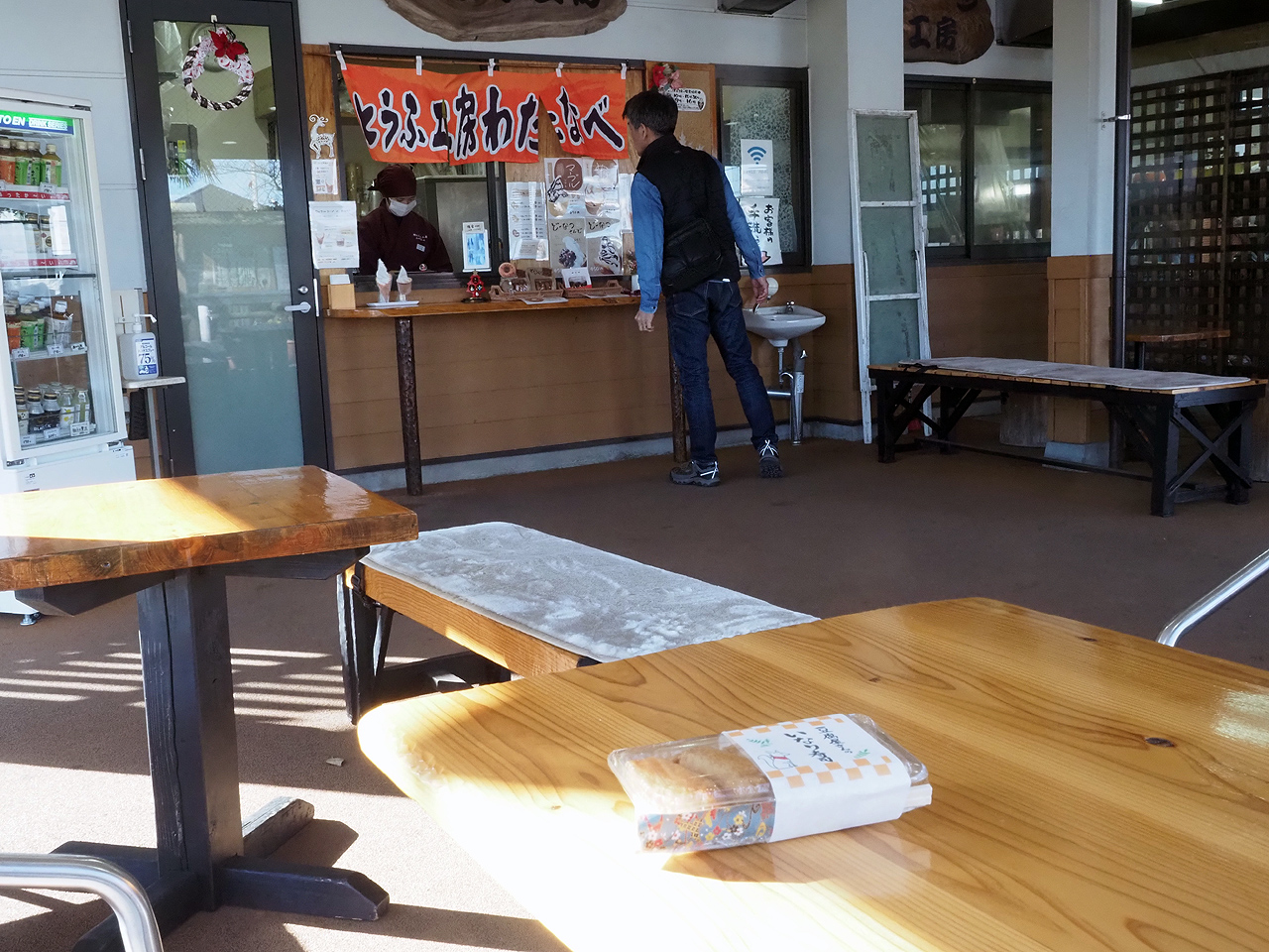 帰りがけにいつもの豆腐屋に寄ったらいなり寿司が売ってた。小腹も空いてたのでこんなんでいいかとカフェテラス?で頂くことに。