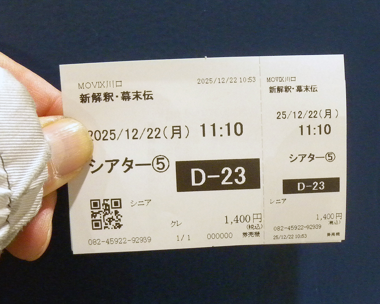 バスに乗って赤羽、東京に出るかと考えたけど面白そうなイベントも無ければ酒を呑む訳にも行かないし面倒なので観たかった映画を観にMOVIX川口まで40分弱歩いて行くことに。平坦な道のりなのでさほど苦もなく寒くもなく11時前には到着し『新解釈・幕末伝』を視聴。っていうかこれからはもうシニア料金で観られるんだなと。還暦万歳?