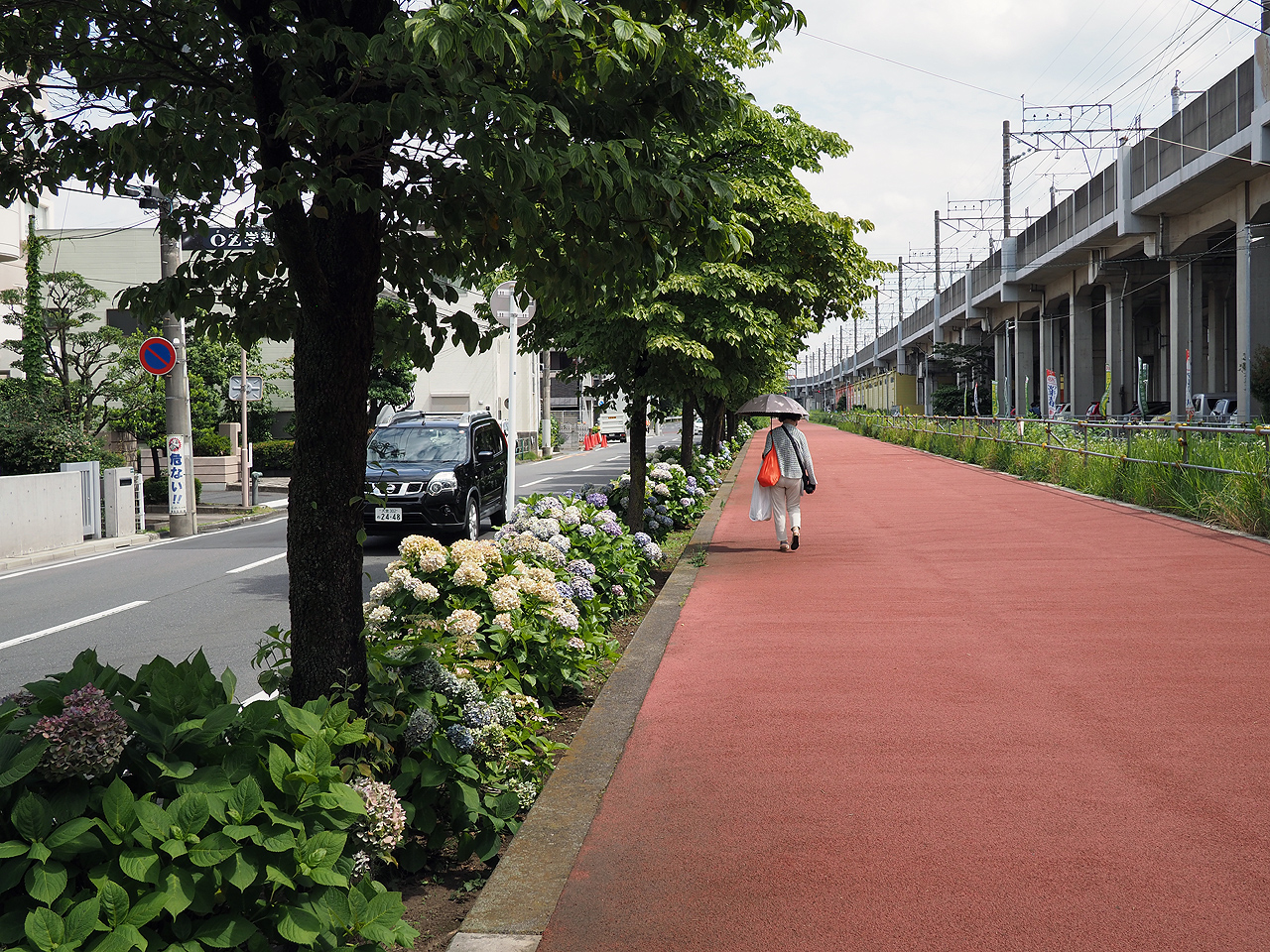 歩いて10分くらいのところ、隣の蕨市になるのですが紫陽花ロードが味わえるところがあります。春は桜並木になるいつもの撮影スポットですがこの季節は紫陽花ロードになります。