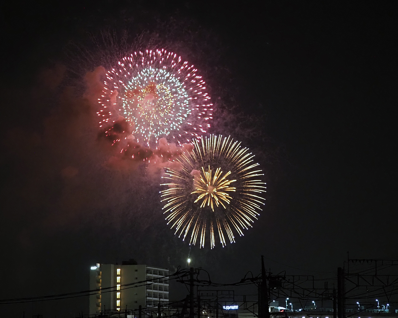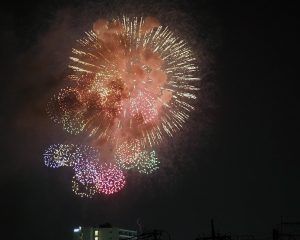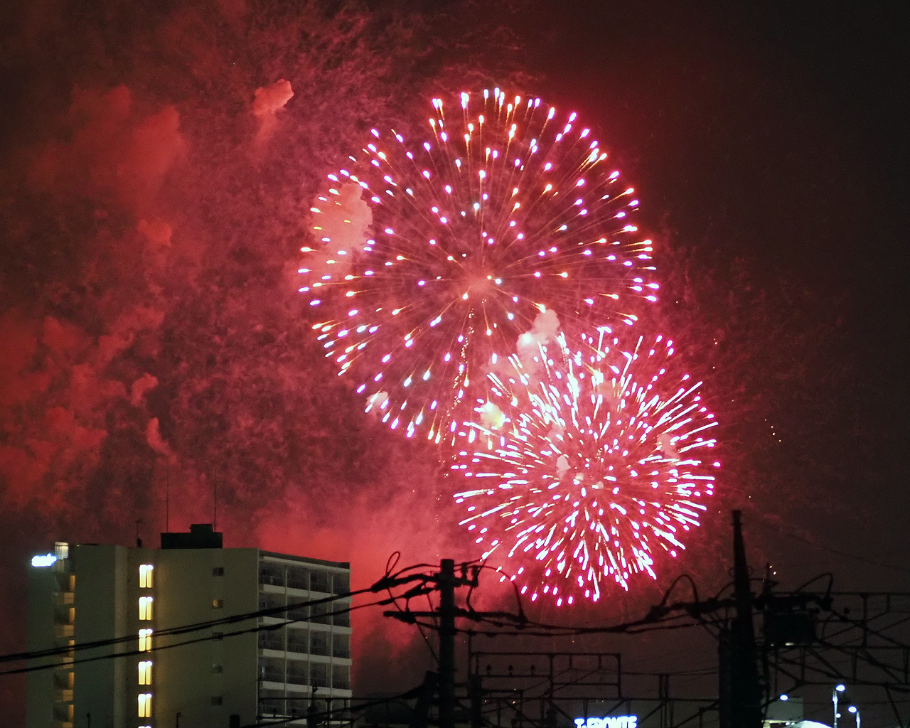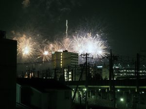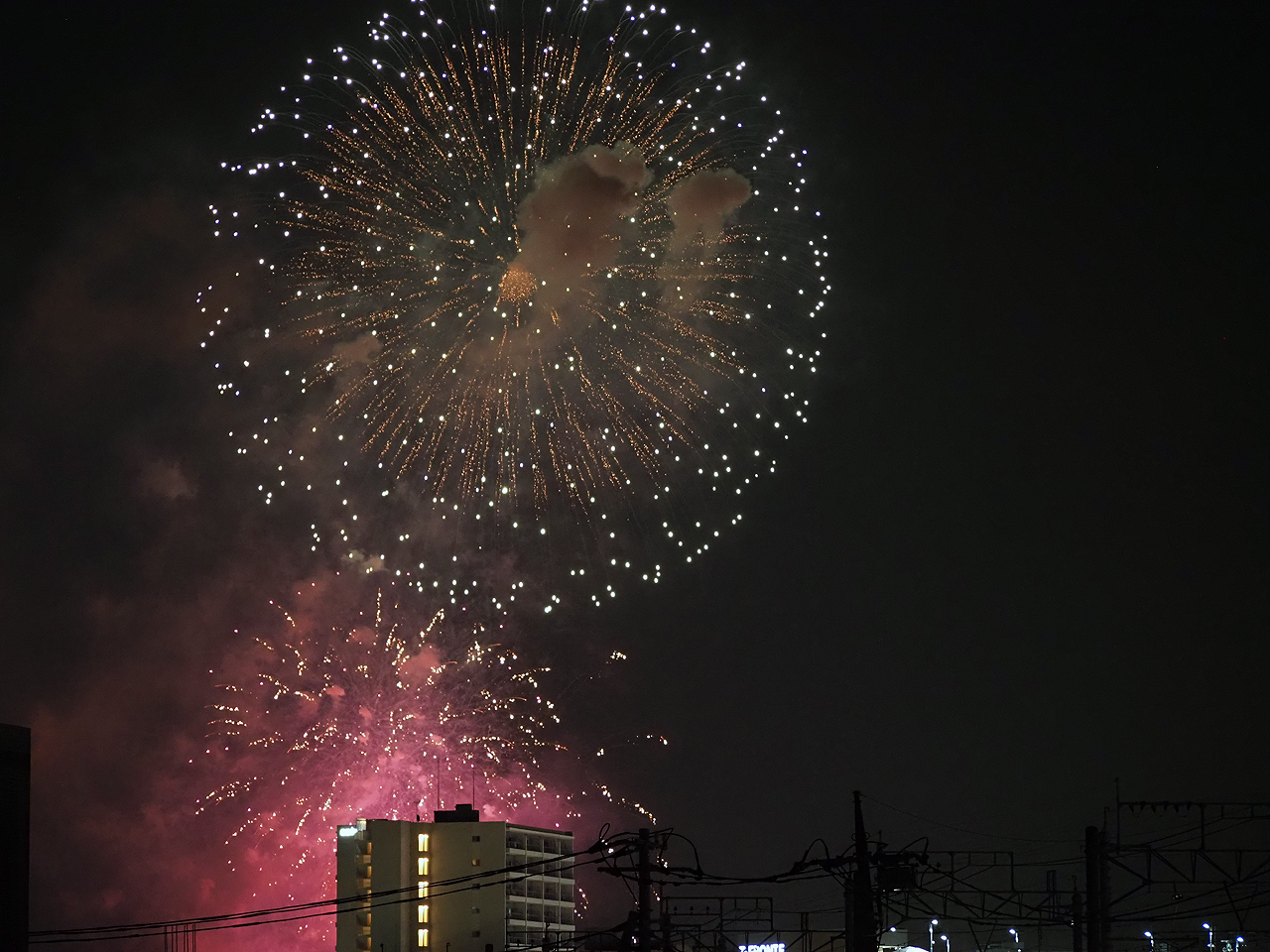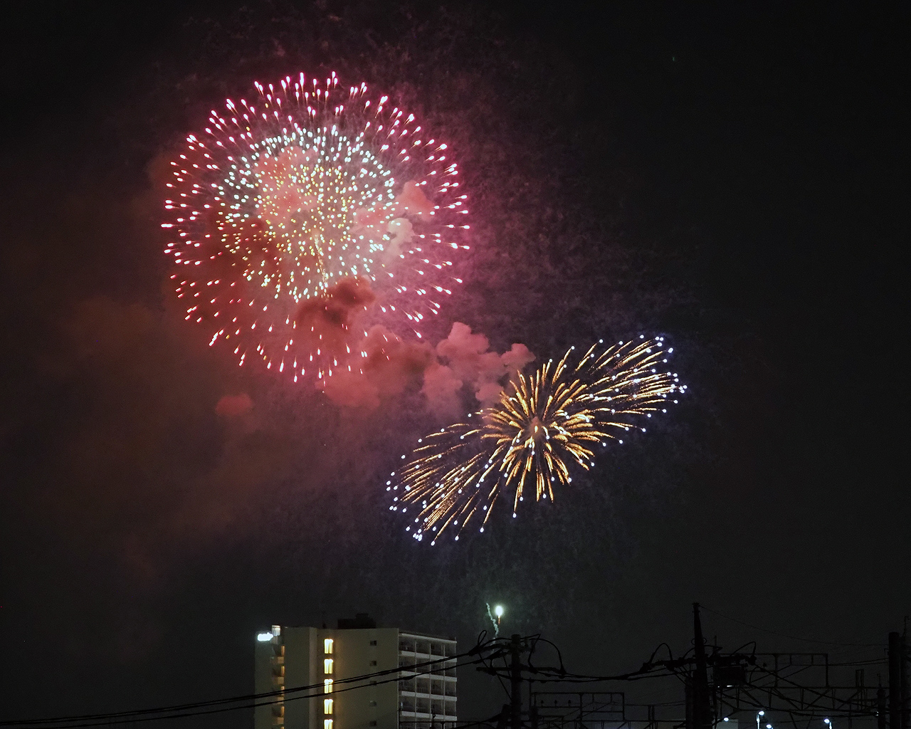 ただ撮っているうちに低い花火は諦めて、逆にマンションが構図的にはいいんじゃないかと思えてきた。