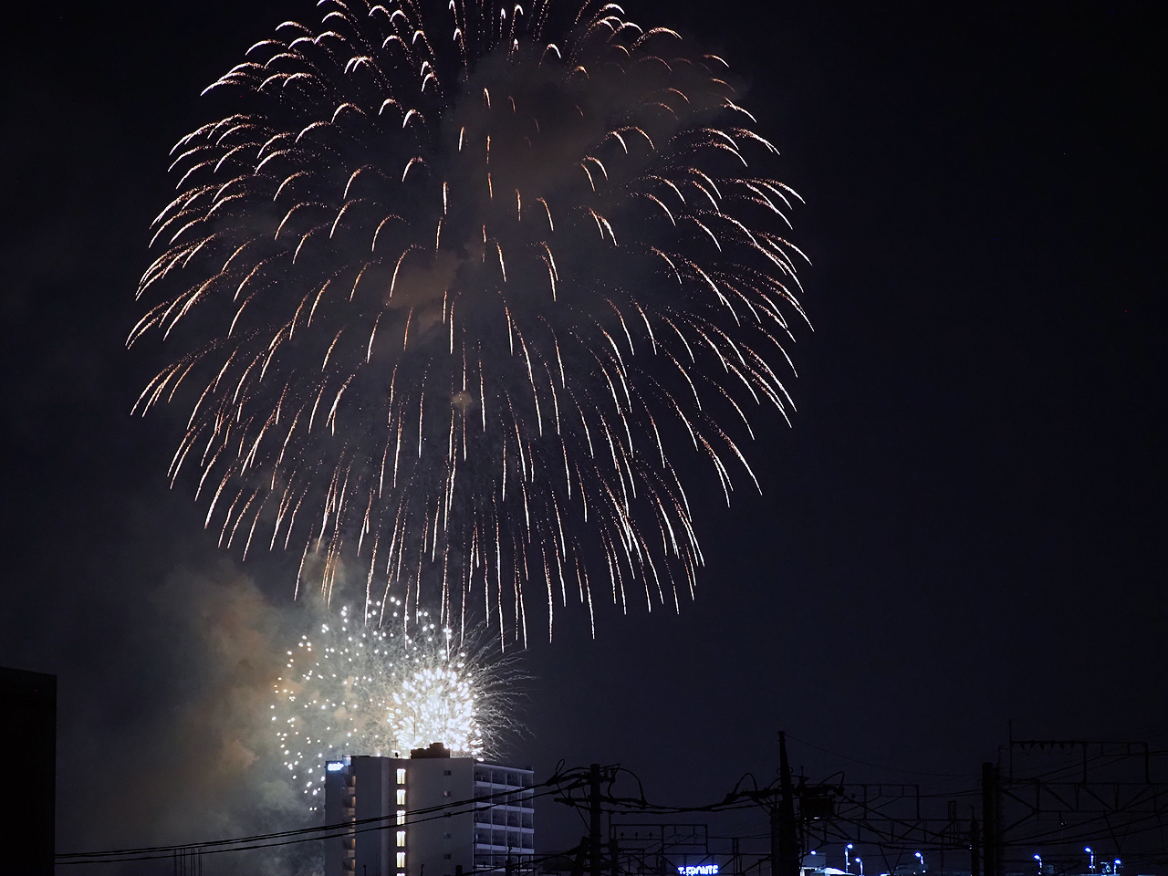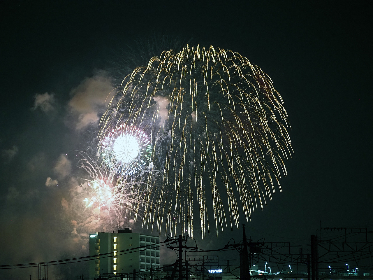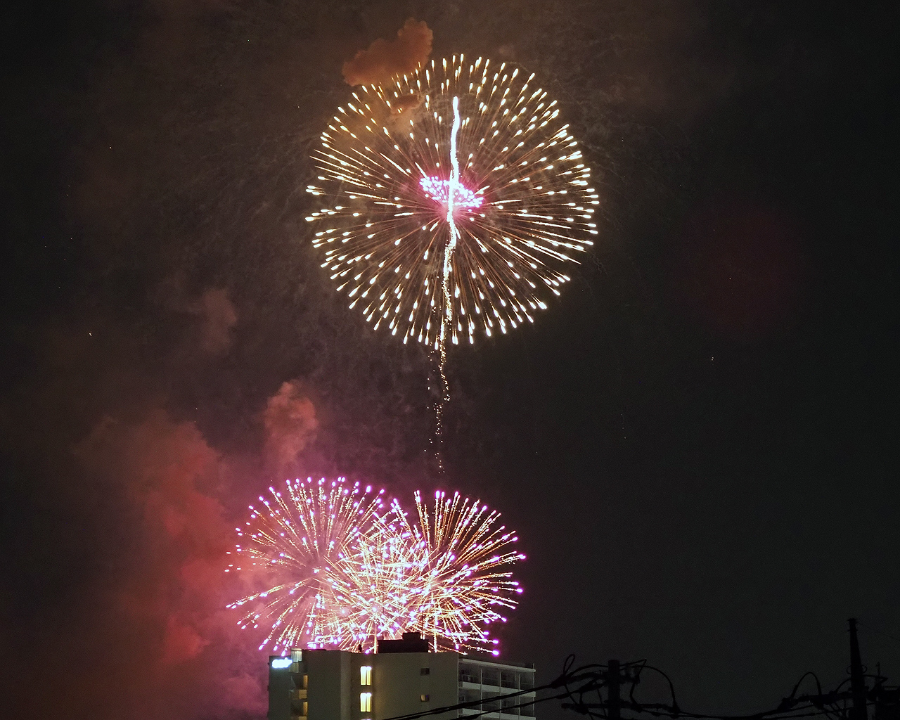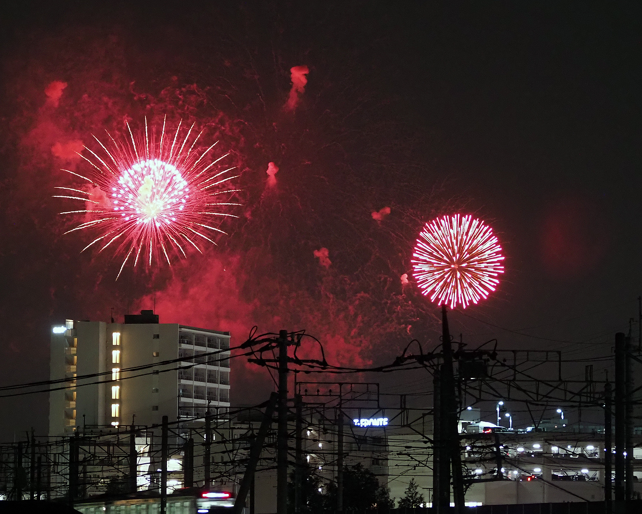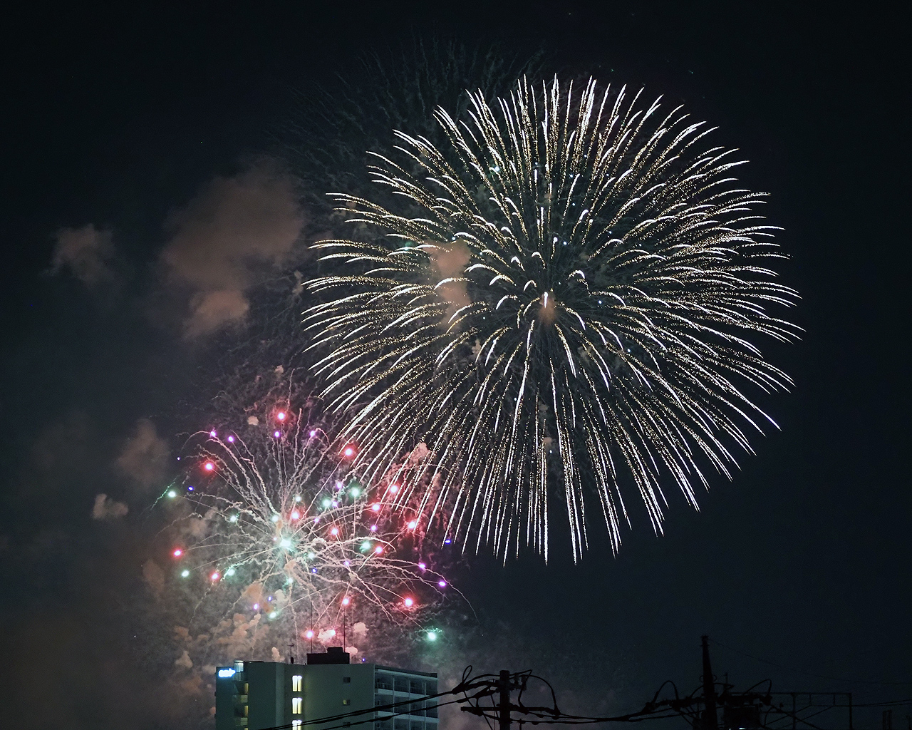 ただ撮っているうちに低い花火は諦めて、逆にマンションが構図的にはいいんじゃないかと思えてきた。