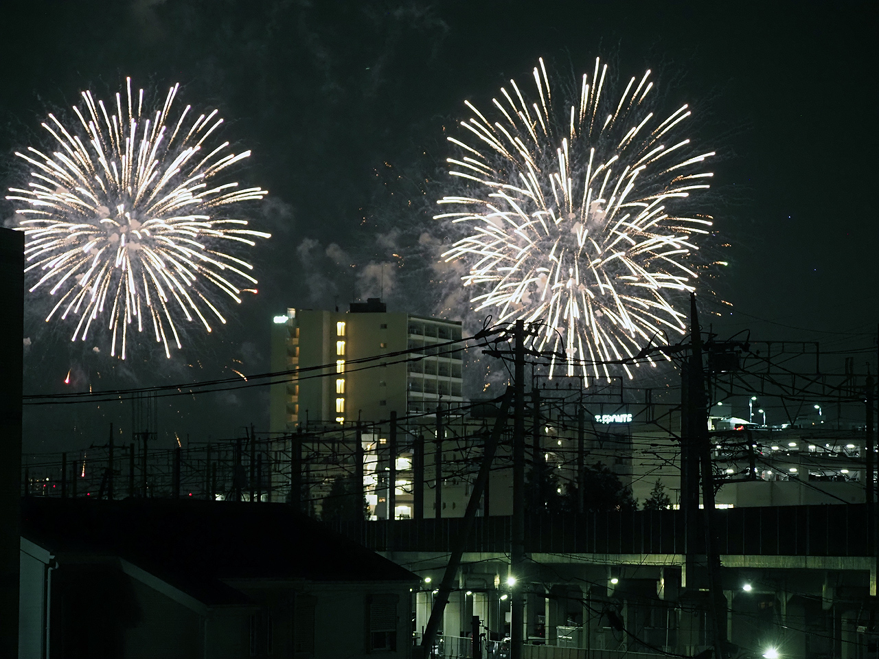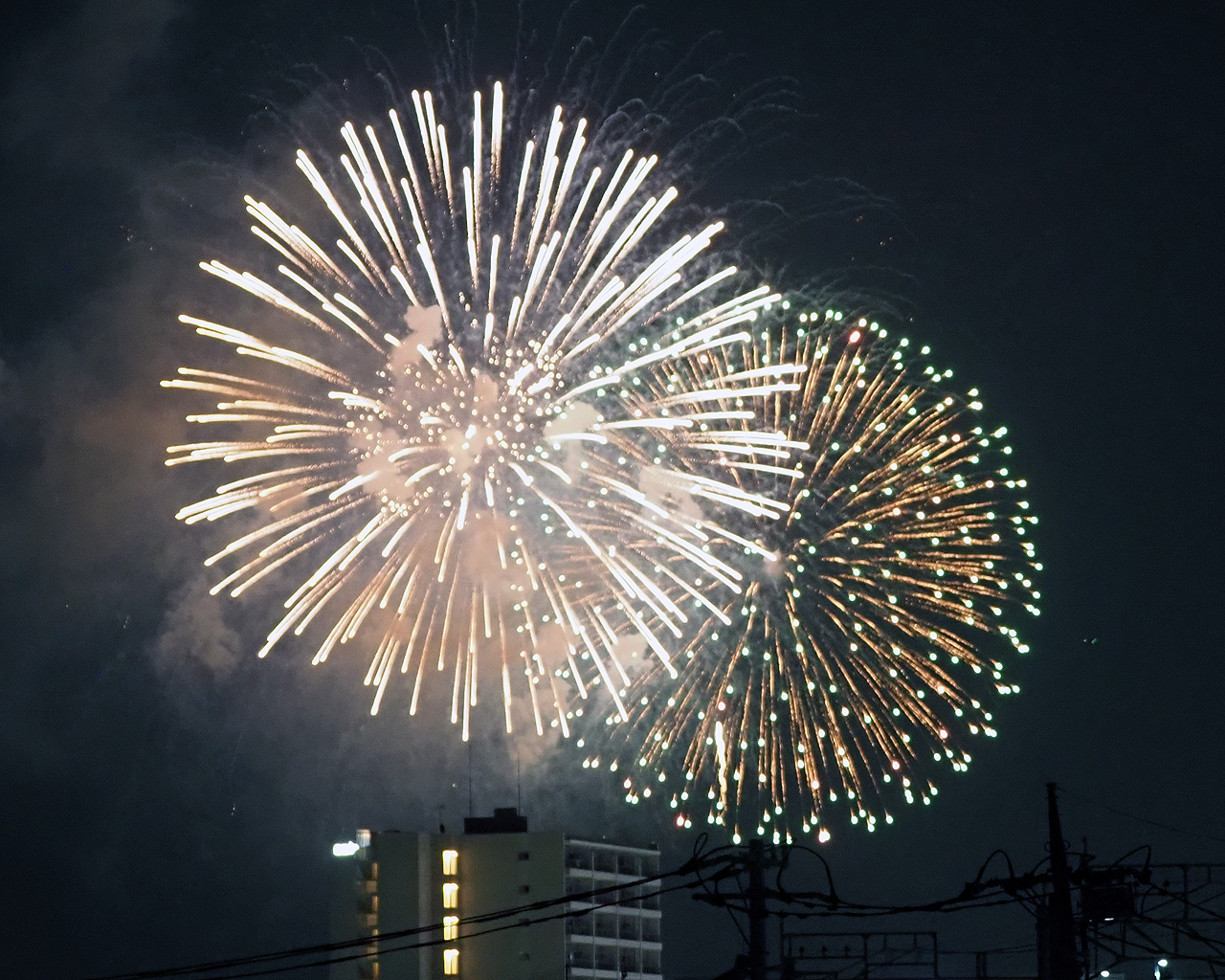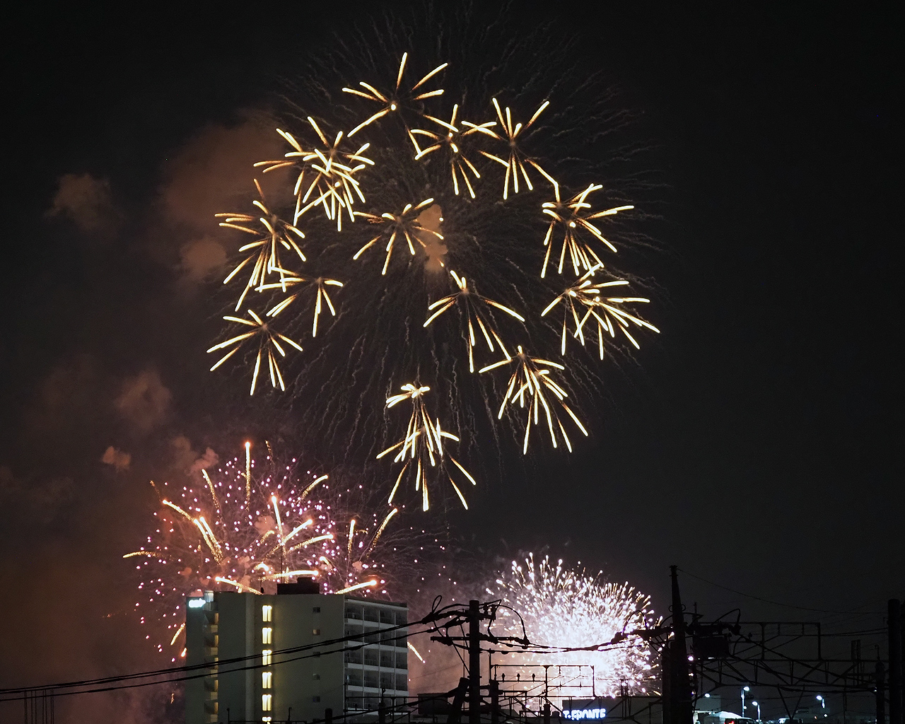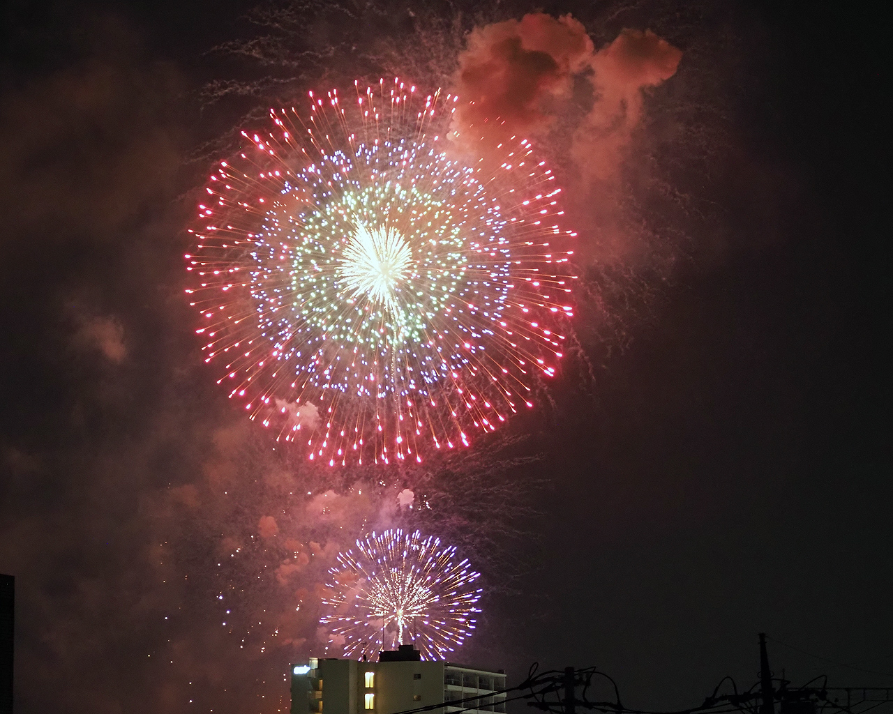 ただ撮っているうちに低い花火は諦めて、逆にマンションが構図的にはいいんじゃないかと思えてきた。